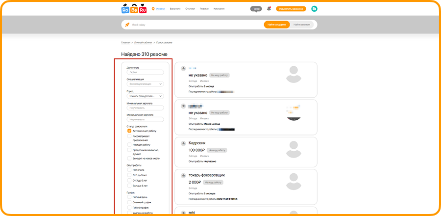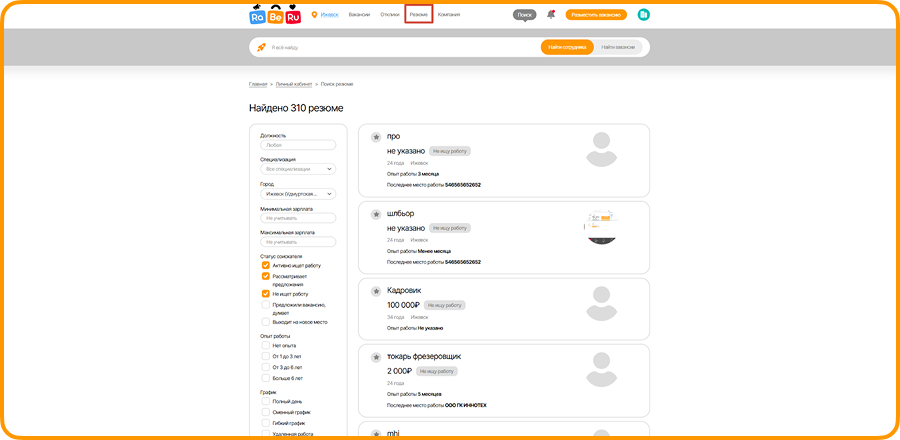 Для того, чтобы найти резюме в базе на сайте, необходимо зайти на сайт и нажать кнопку “Резюме”: