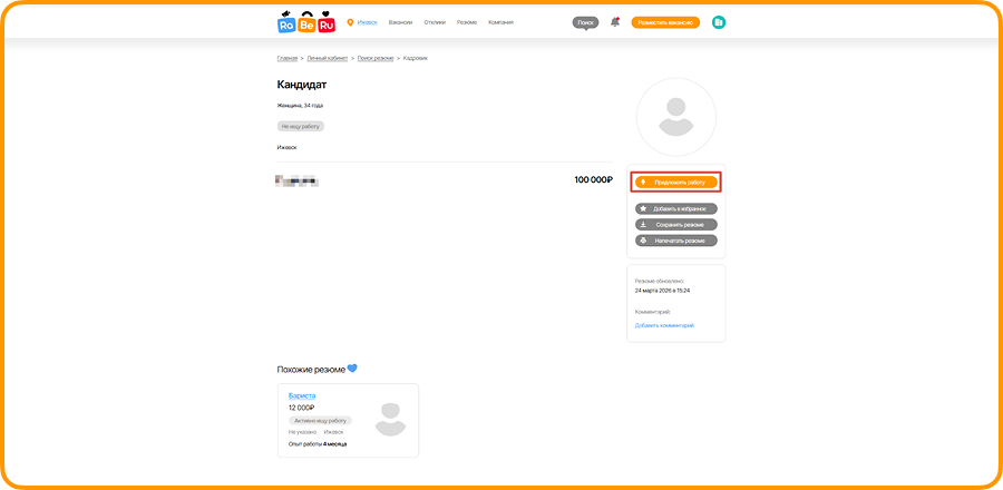 Вы можете зайти в резюме кандидата и пригласить его на работу:
