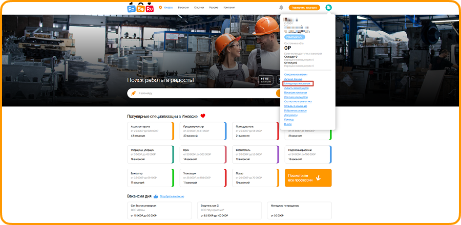 Для того, чтобы добавить менеджера, перейдите в профиль работодателя и нажмите на меню в верхнем правом углу: