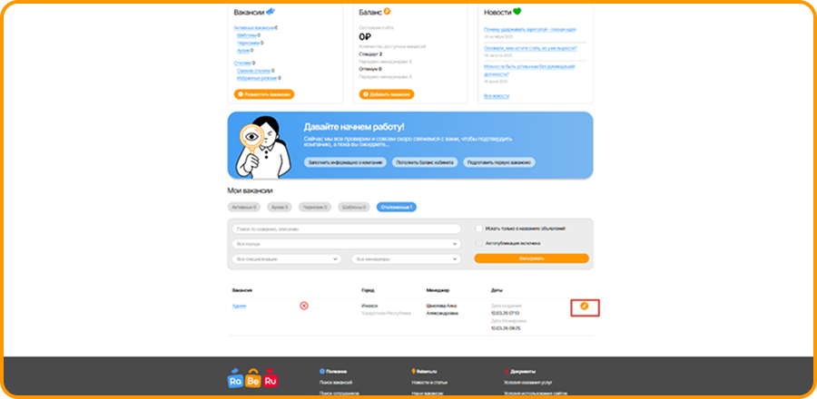 После блокировки вакансию нужно отредактировать. Сделать это нужно, нажав кнопку "Редактировать":